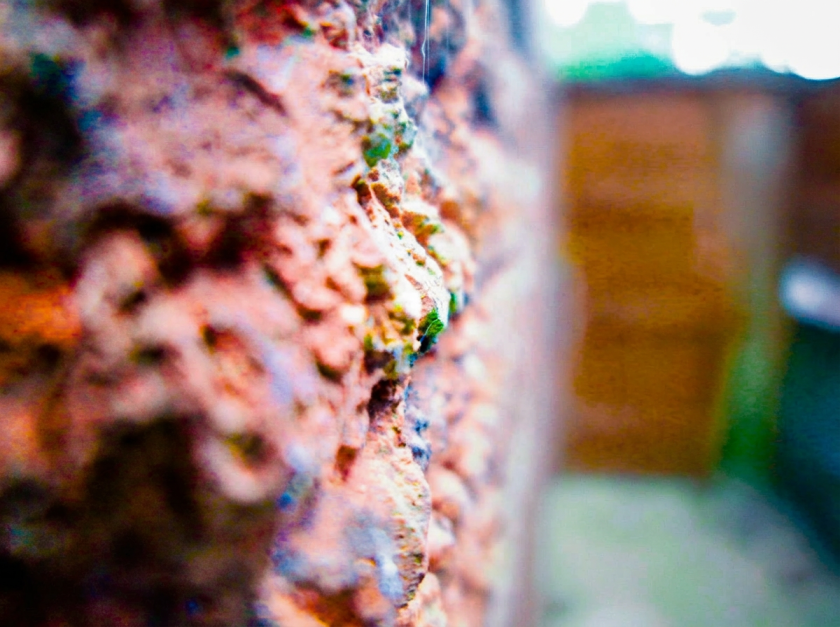 An outside wall with colours galore brought out by extreme close up in bright sunlight. On the right is a garden path with a gate at the far end.