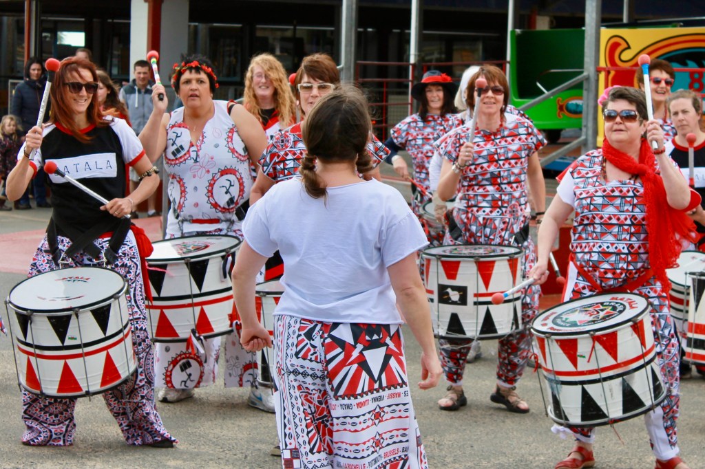 This image captures a performance by Batala, an international samba reggae drumming project.